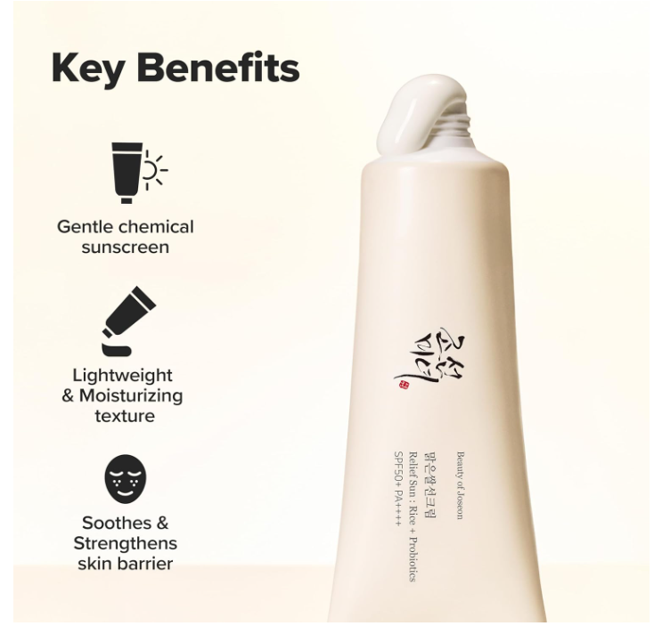 Beauty of Joseon Relief Sun Rice + Probiotics Sunscreen SPF50+ 50ml moisturizes and nourishes the skin while providing very high sun protection in a pleasant formula with a creamy lightweight texture.