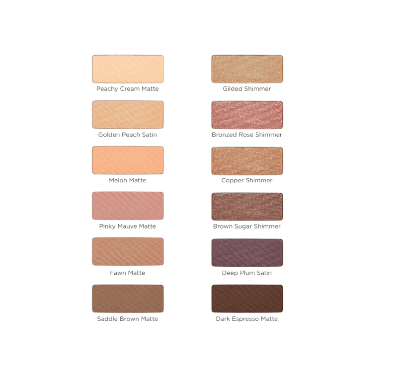 * Powder eyeshadow in peachy cream (matte), golden peach (satin), melon (matte), pinky mauve (matte), fawn (matte), saddle brown (matte), gilded (shimmer), bronzed rose (shimmer), copper (shimmer), brown sugar (shimmer), deep plum (satin), dark espresso (matte)