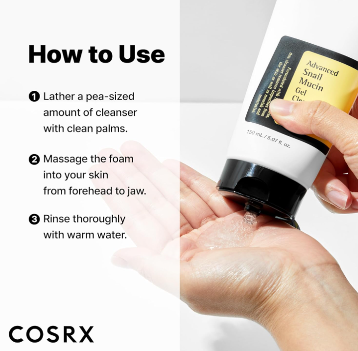 how to use 50ml After wetting your skin, squeeze out a pea-sized amount of cosrx advanced snail mucin power gel cleanser into your palm.