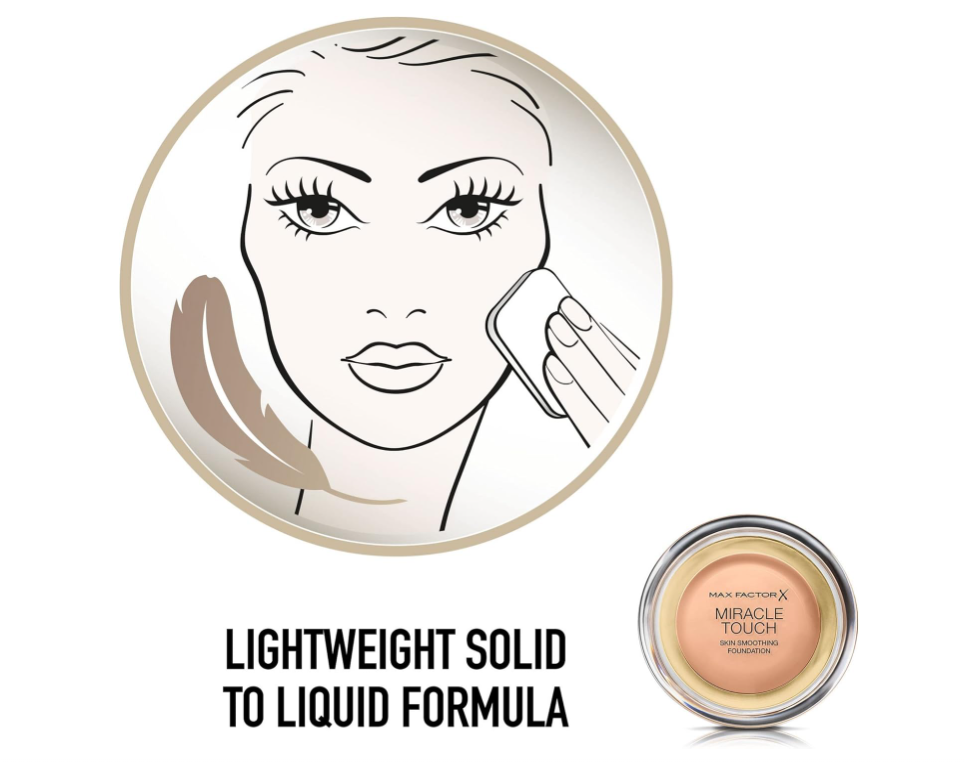 The unique all-in-one Max Factor Miracle Touch Foundation has a solid-to-liquid formula to give you a flawless base with one easy application, with no need for concealer and powder. Miracle Touch reduces the appearance of redness, dark spots and blemishes and leaves the skin feeling and looking moisturised.