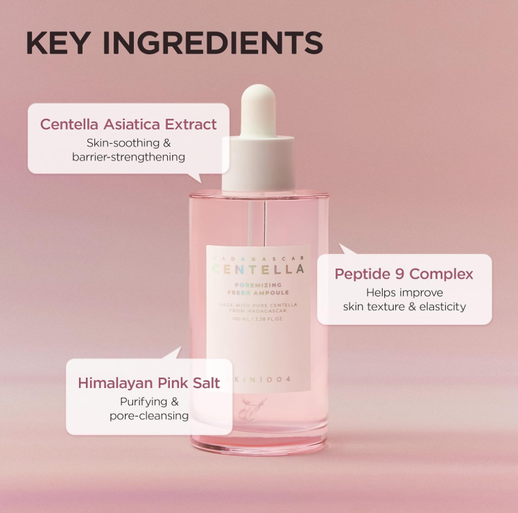 SKIN1004 Madagascar Centella Poremizing Fresh Ampoule is a pore-care solution designed to cleanse, tighten, and refine skin while boosting elasticity. Infused with Himalayan Pink Salt rich in 80 minerals, this ampoule clears out impurities lodged in pores for a cleaner, smoother complexion. A 9-peptide complex supports collagen and elastin synthesis to lift and firm sagging pores, while Centella Asiatica extract and Aloe Vera soothe irritation and hydrate the skin. With its watery, oil-free texture, it absorbs quickly to deliver a refreshing and non-sticky finish, making it suitable for oily, combination, and sensitive skin types.