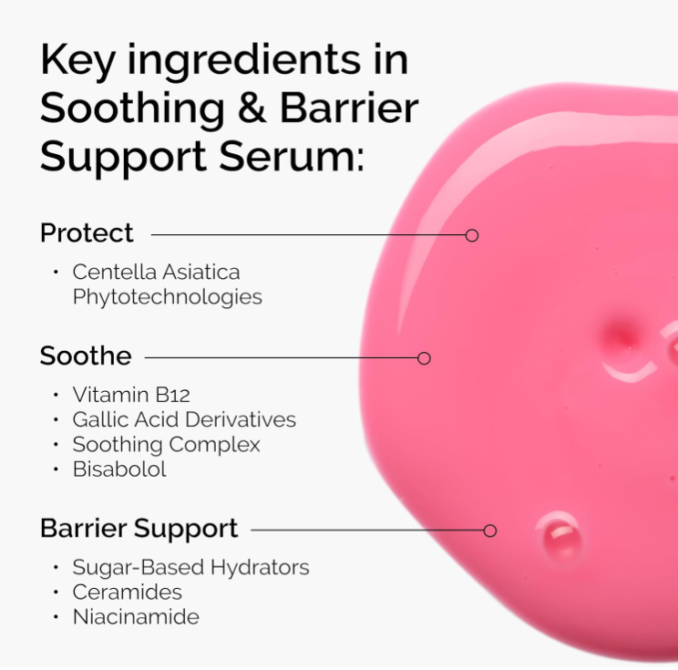 The Soothing & Barrier Support Serum is a multi-active solution that aims to reduce the appearance of irritated skin. It supports the regeneration of the skin barrier within 2 hours* and provides an immediate increase in skin moisture by 86%**. This helps to relieve discomfort and reduce signs of redness. The Soothing & Barrier Support Serum not only strengthens the skin barrier, but also improves the appearance of uneven skin structures and ensures a smoother complexion. This comprehensive serum contains multiple vitamins, lipids and phytotechnologies and is suitable for all skin types, including sensitive skin. The multi-active formula contains eight key technologies: Vitamin B12: supports the skin barrier by reducing dryness and redness while giving the serum its signature pink color. Gallic Acid Derivatives A combination of three activated forms of gallic acid (propyl gallate, gallyl glucoside and epigallocatechin allyl glucoside (EGCG)) helps to relieve skin discomfort and fight redness caused by irritants. Bisabolol: helps reduce skin redness Soothing complex: reduces the feeling of skin tension and discomfort due to dryness. Ceramide complex: vegetable ceramides (sphingolipids and phospholipids) provide the skin locally with important skin components. 2% Niacinamide: supports key skin components that promote hydration. SUGAR BASED MOISTURISERS: Moisturize the skin and support the skin barrier. Centella Asiatica Phytotechnologies: isolated triterpenes; asianicoside, madecassic acid and asian acid, derived from Centella Asiatica (Gotu Kola) that protect the skin from irritants. Tests show: Repairs and strengthens the skin barrier Provides an immediate increase in skin moisture by 86% Ensures all-day hydration Reduces the appearance of redness Improves the appearance of uneven skin texture for a smoother appearance *Clinical tests on 23 people after one application. **Clinical tests on 34 people, twice daily for 6 weeks.